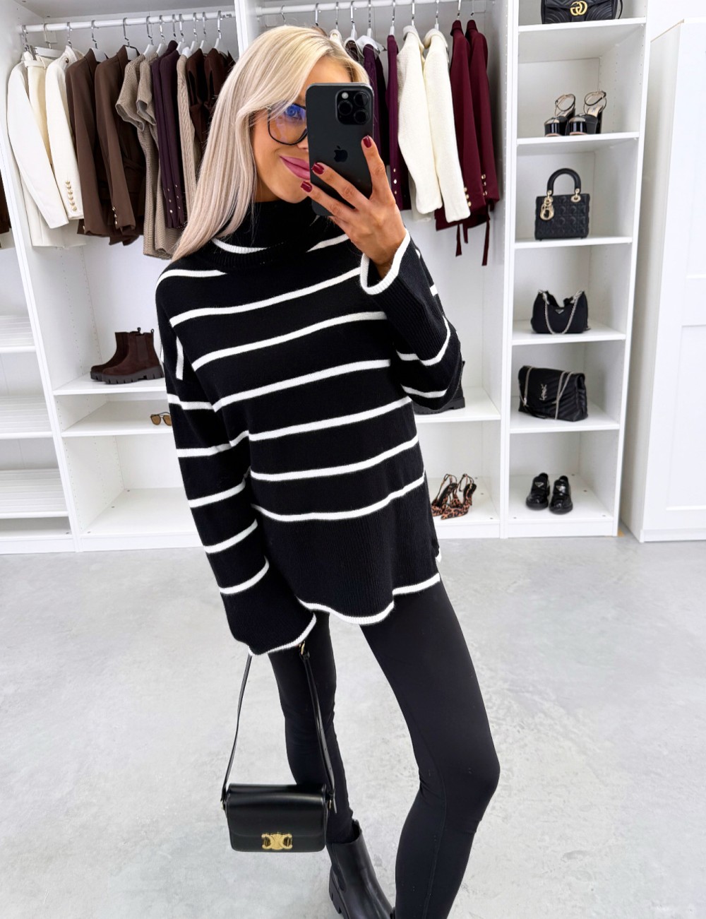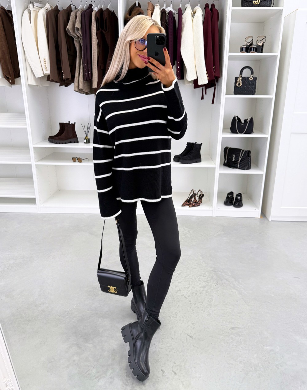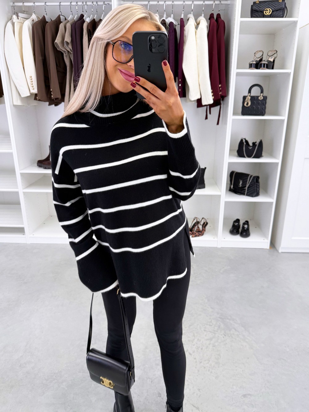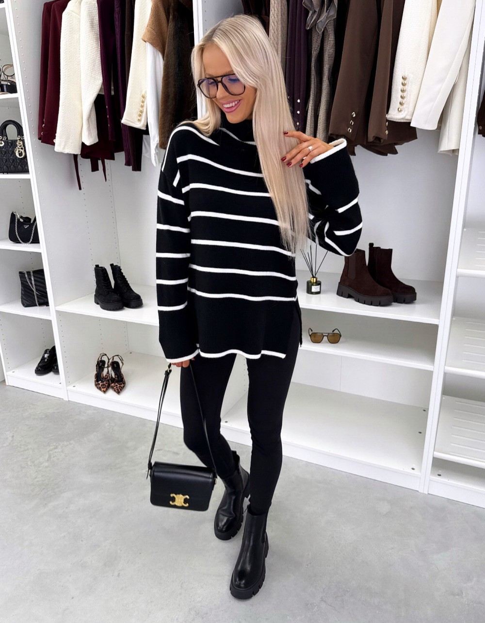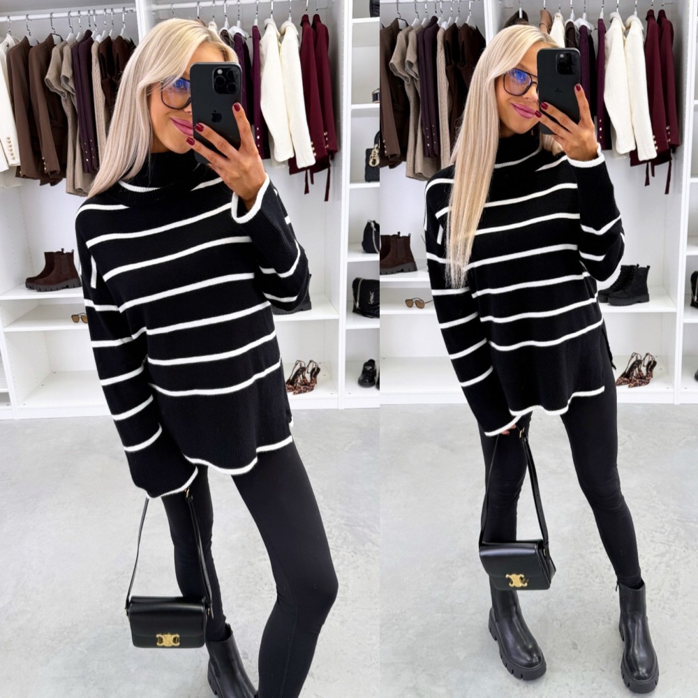 Kõrge kaelusega triibuline kampsun (Üks suurus, Must)