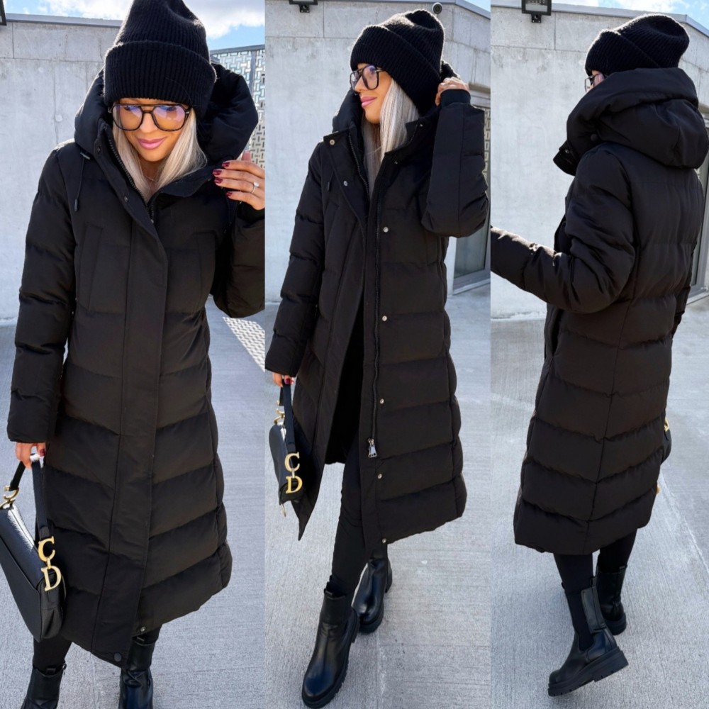 Dłuższa ciepła parka zimowa z kapturem (M, Czarny)